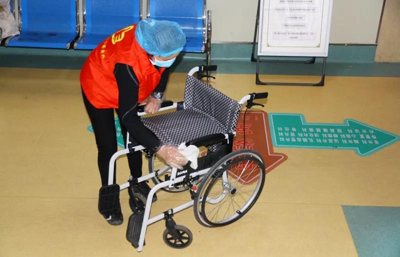 在医院的轮椅存放处,志愿者兰伟伟正在给一辆轮椅消毒。她给轮椅的每一个部位都喷上消毒液,对患者及家属常接触的部位,她反复擦拭。“这些轮椅,患者可以免费使用,每次归还,我们都会进行消毒。此外,不管使用与否,每天早晚我们还会进行两次集中消毒。”