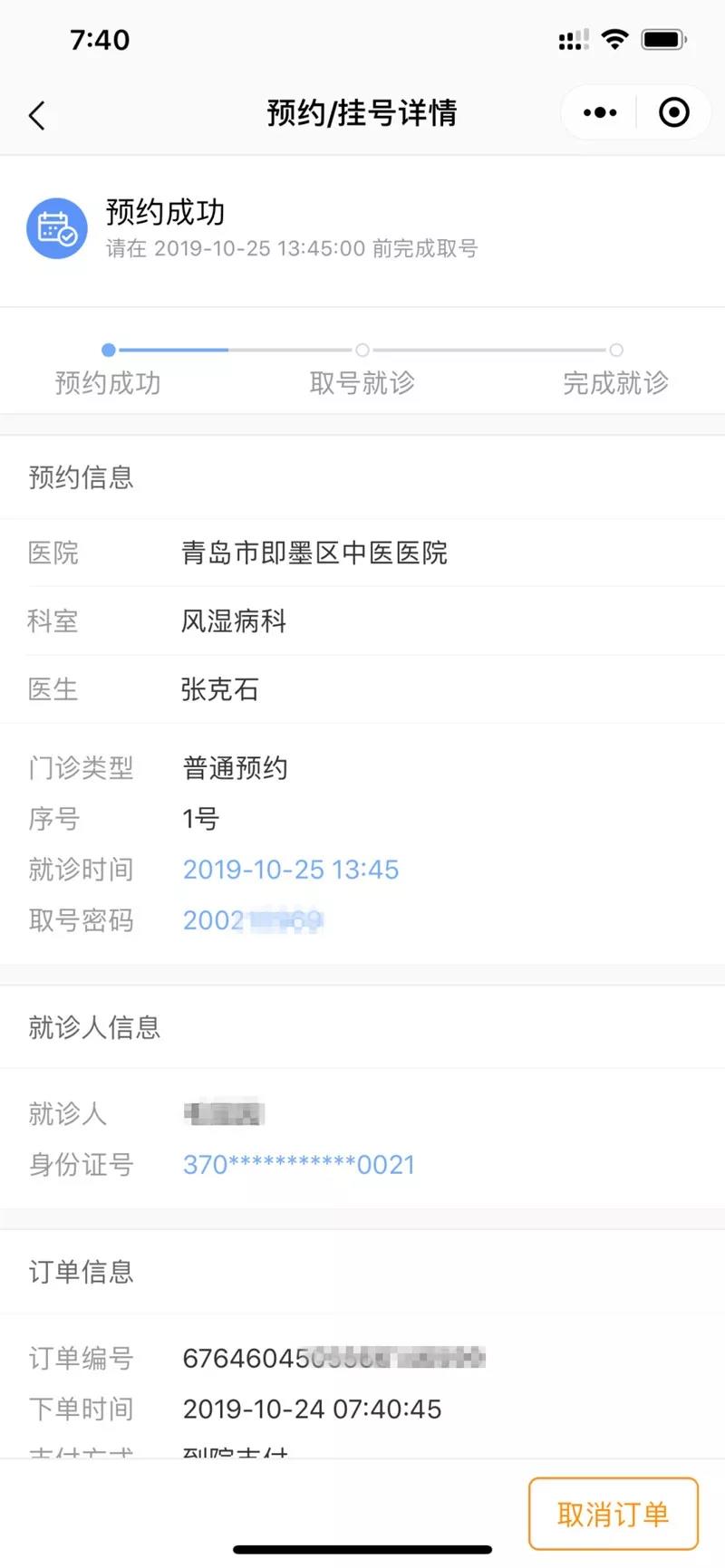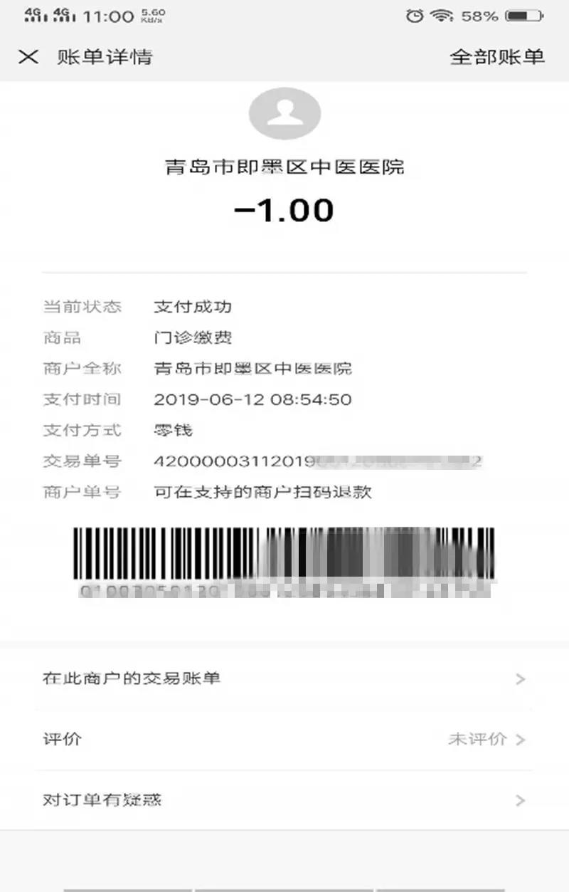申领电子健康卡的患者可直接持电子健康卡的二维码到医生处就诊,无需充值排队,在医生处扫码后可以用微信或者支付宝的二维码直接在医生处支付挂号费。病人支付成功微信界面: