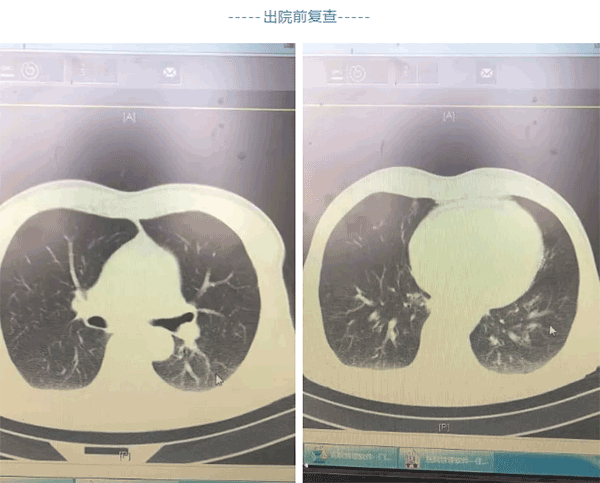 出院前复查颅脑胸部CT示积液和肺不张胸腔积液恢复良好,患者可以正常行走,现已经顺利出院。