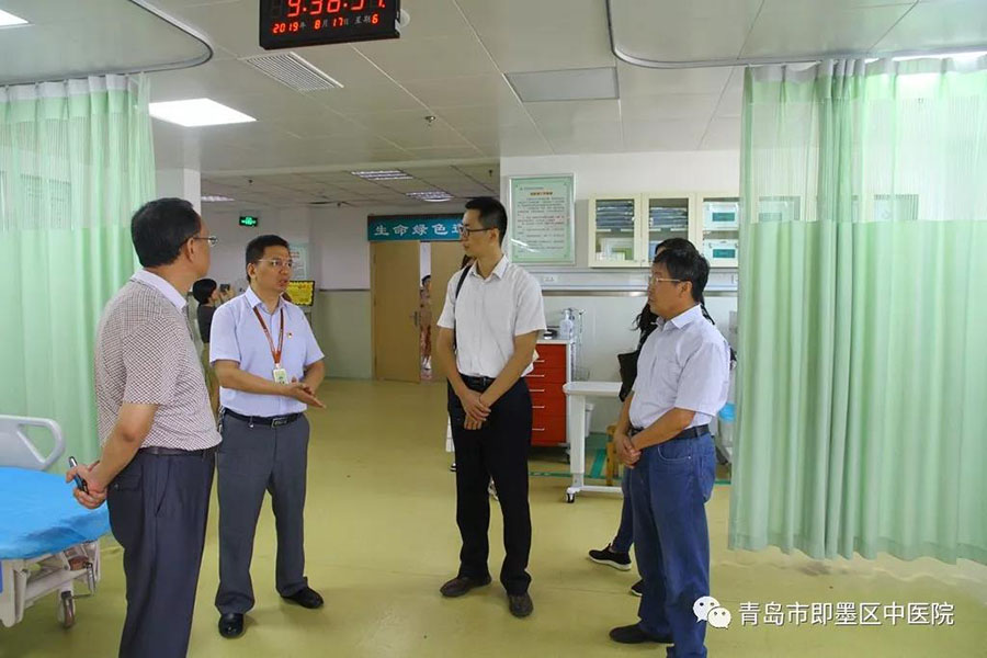 2019年8月17日,山东省中医院医务处褚志杰处长、山东中医药大学副教授莫颖宁等一行6人,在青岛市卫生健康委中医药处处长汪运富,即墨区公立医院管理中心党总支书记乔绪辉,即墨区公立医院管理中心医务管理科科长于飞翔的陪同下,来我院开展全省中医药发展现状和战略研究项目调研。我院党委书记、理事长祝明浩,我院党委 副书记、院长赵成欣及相关科室负责人陪同调研。